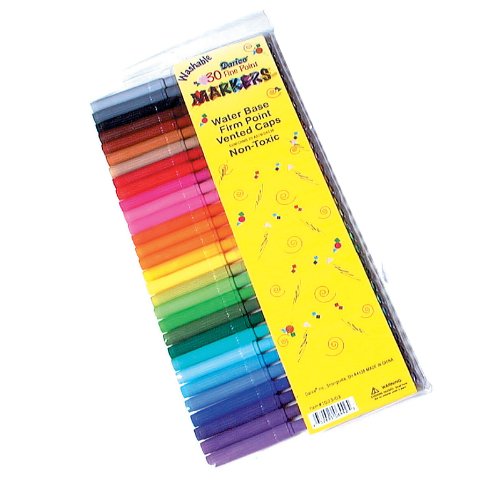 This package of fine point washable markers is just the thing for the creative child's art projects. 30 markers in a rainbow of colors wash out of clothes easily.